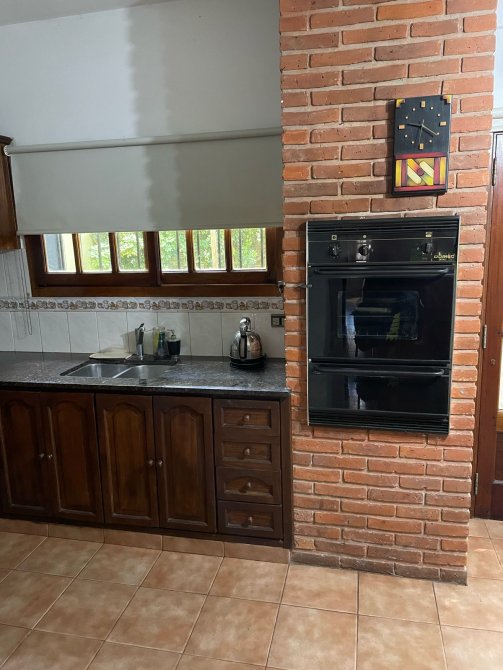 Cocina amueblada en madera alto y bajo mesada con anafe y horno empotrado