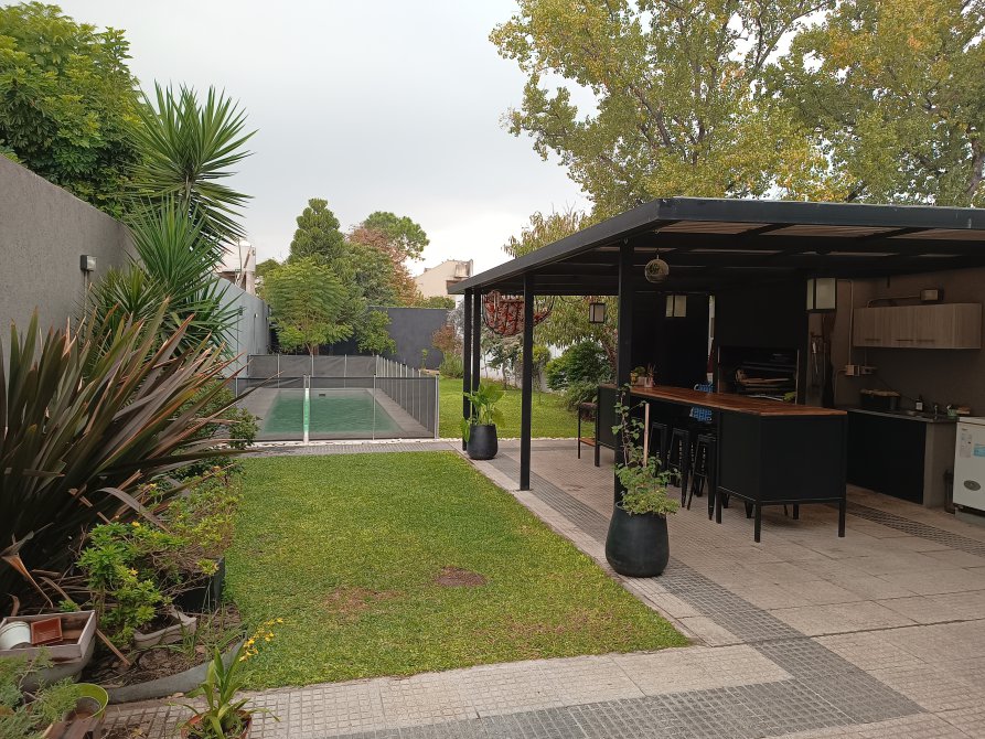 Cuenta con cochera para 2 autos fondo libre con piscina, quincho semicubierto completo con parrilla y bacha auxiliar amoblada .