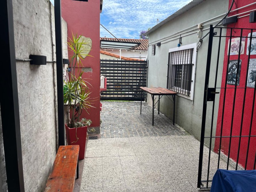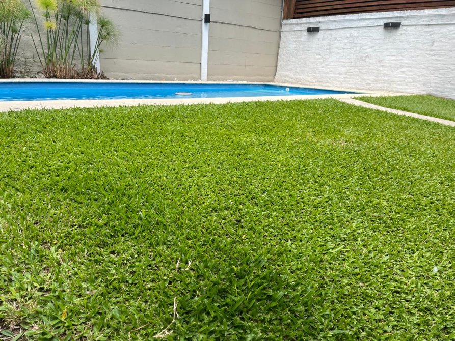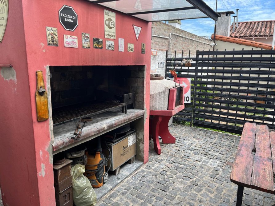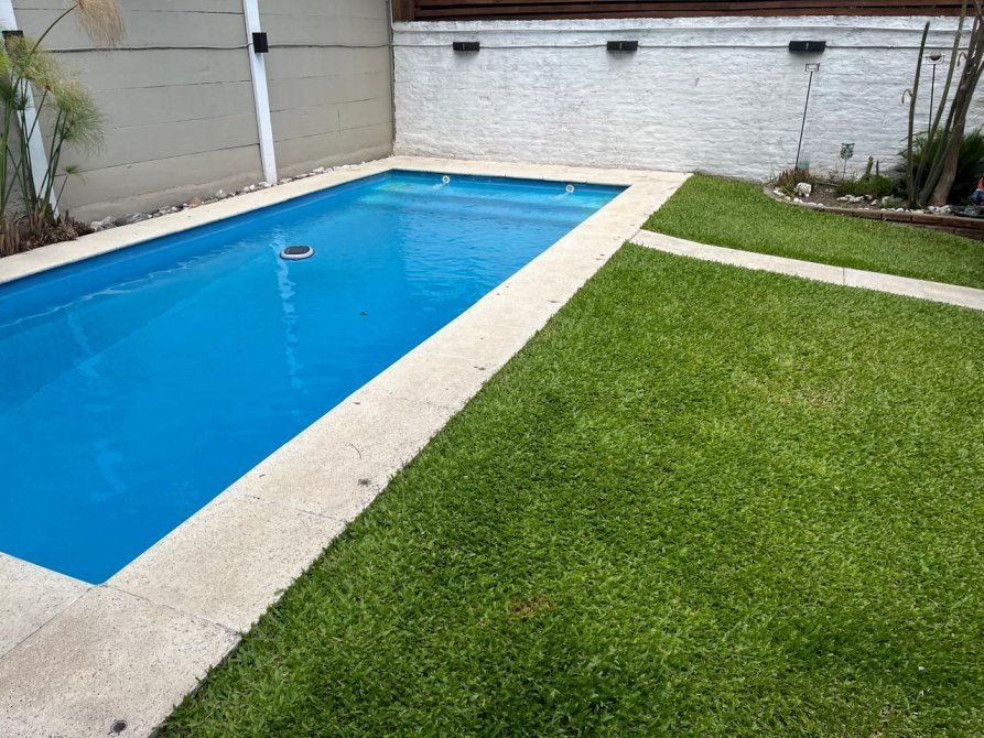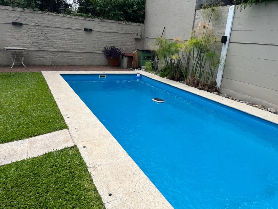 Lavadero, patio, y esapcio semicubierto con parrilla y jardin con pileta.