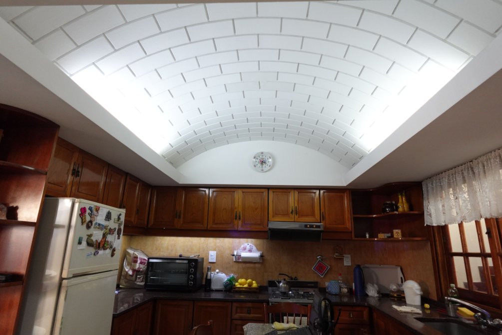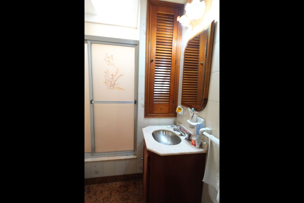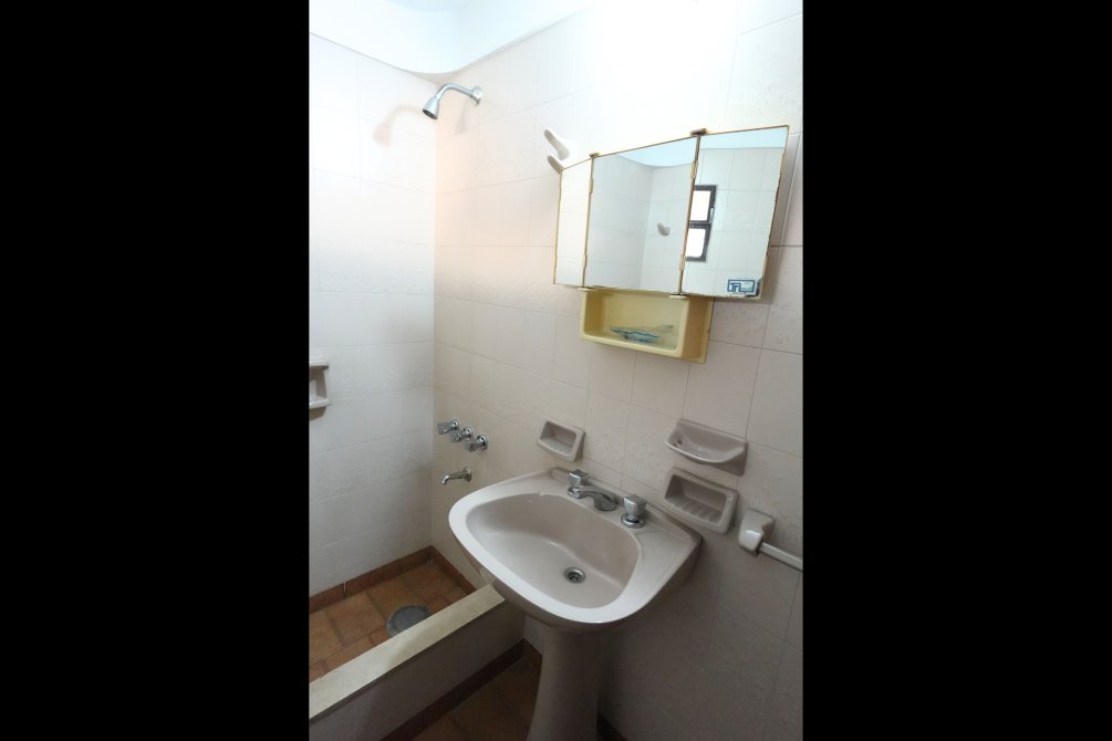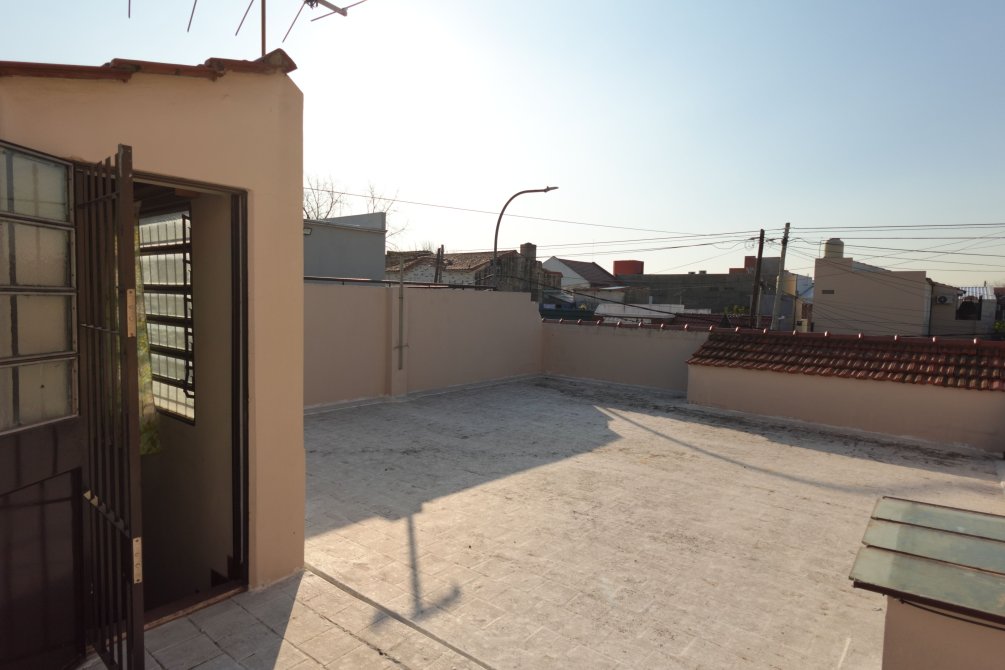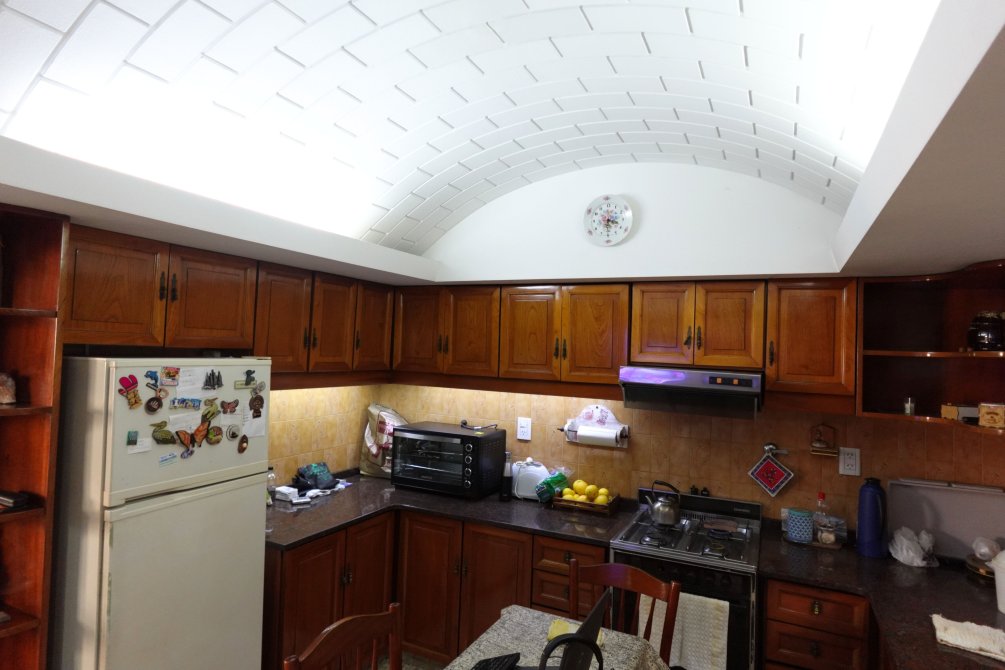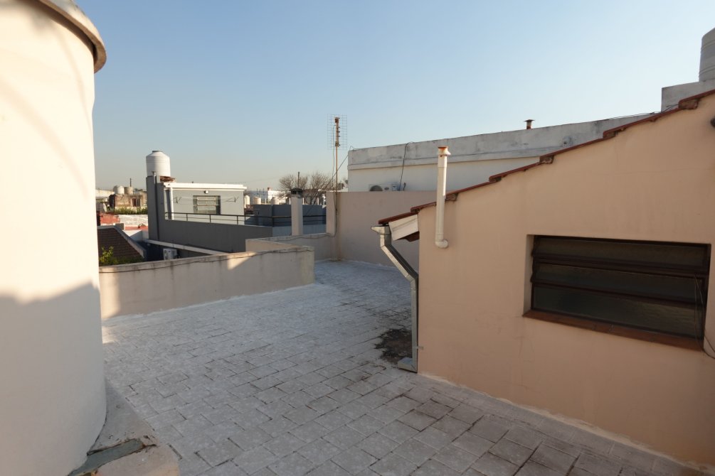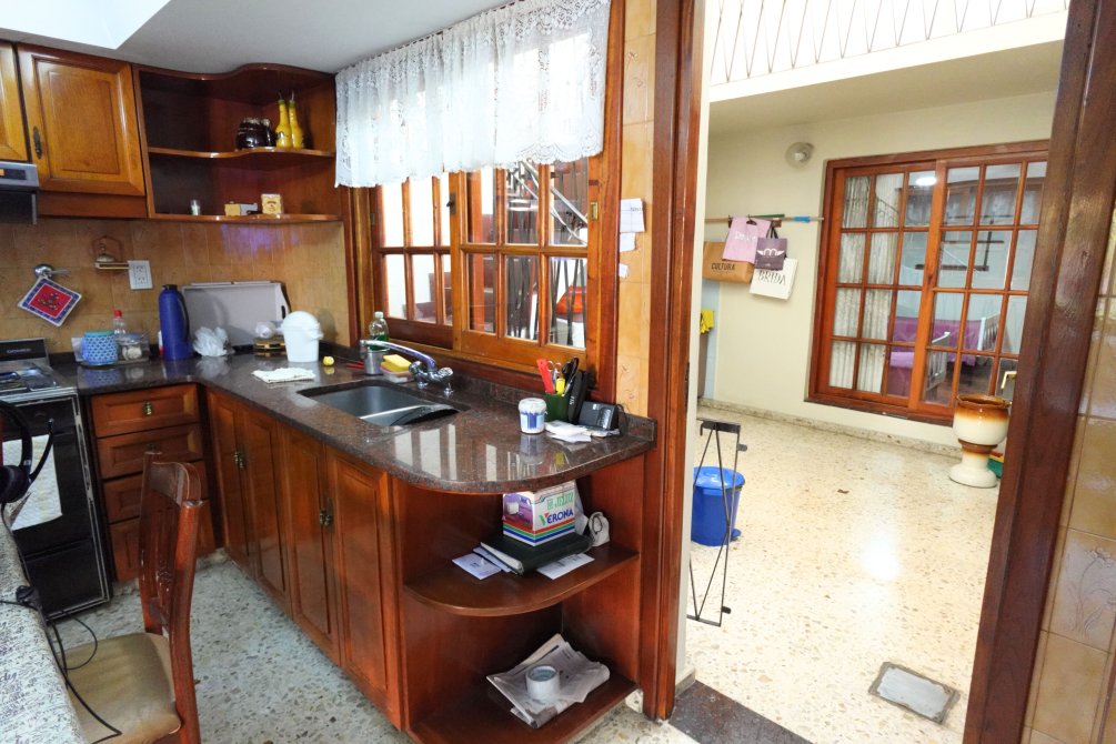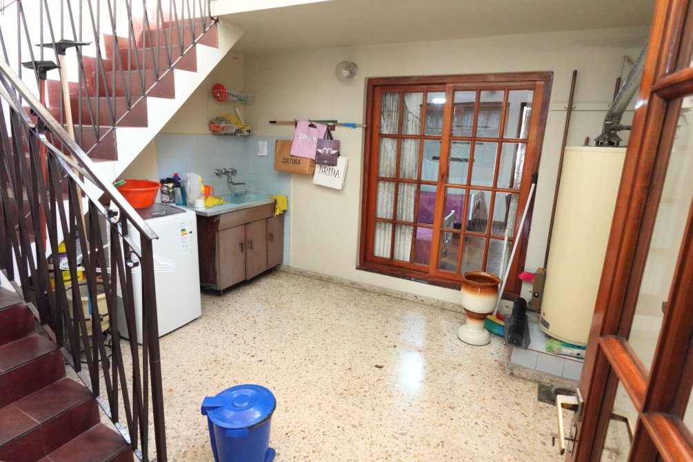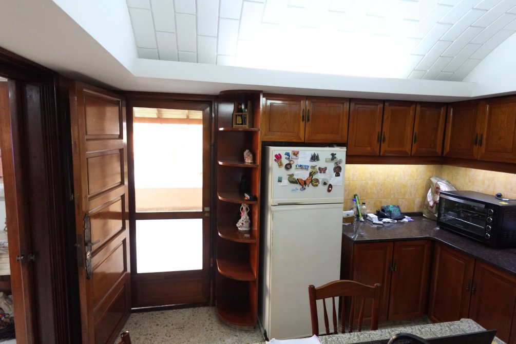 Siguiendo, nos encontramos con la cocina con muebles alto y bajo mesada, en un estado impecable, con detalles también en el cielo raso. Desde este ambiente, salimos al patio de aire y luz, donde se encuentra el termotanque y el lavadero; y por la escalera subimos a la amplia terraza.