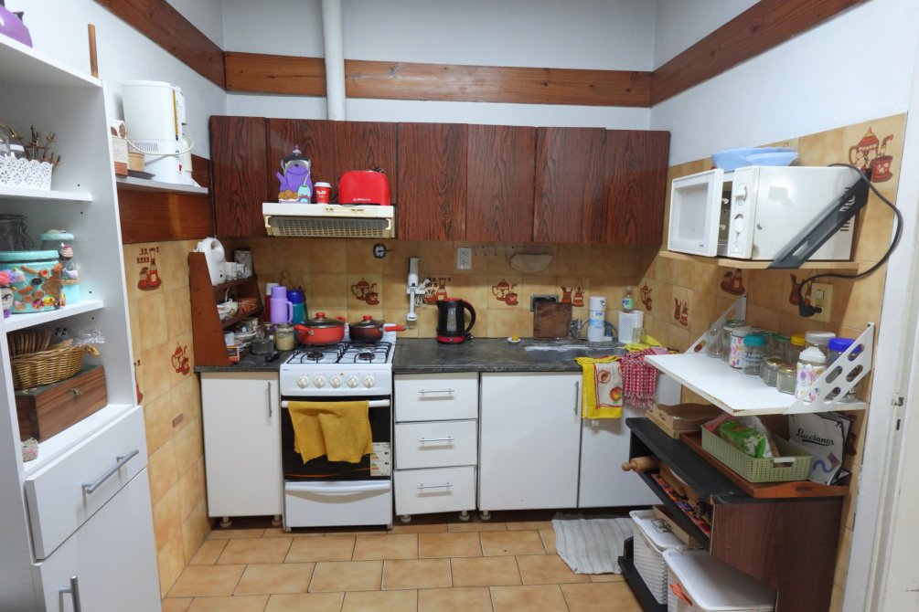 Cocina con muebles alto y bajo mesada que da acceso al living comedor tipo jardín de invierno que cuenta con el tercer dormitorio y un baño auxiliar, y se conecta a la cochera mediante una puerta de acceso.
