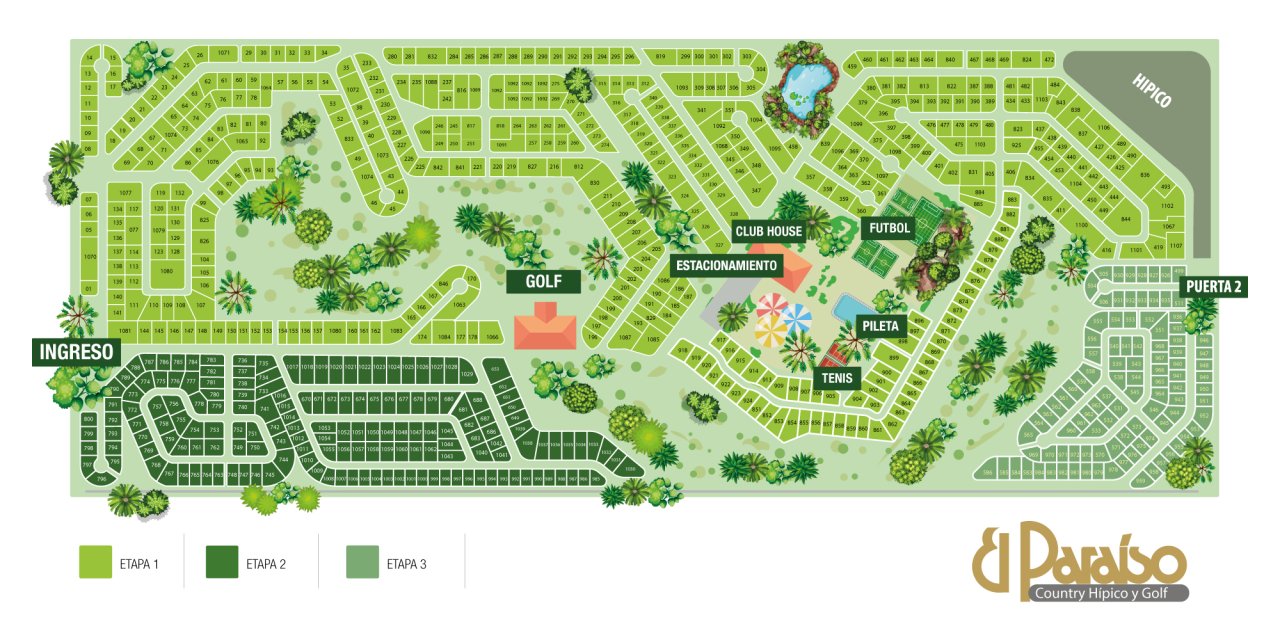 -Espacios Verdes: El Paraíso Country Hípico y Golf tiene más del 45% de espacios verdes, Arboledas de más de 100 años y 8 lagunas con Fauna Autóctona.