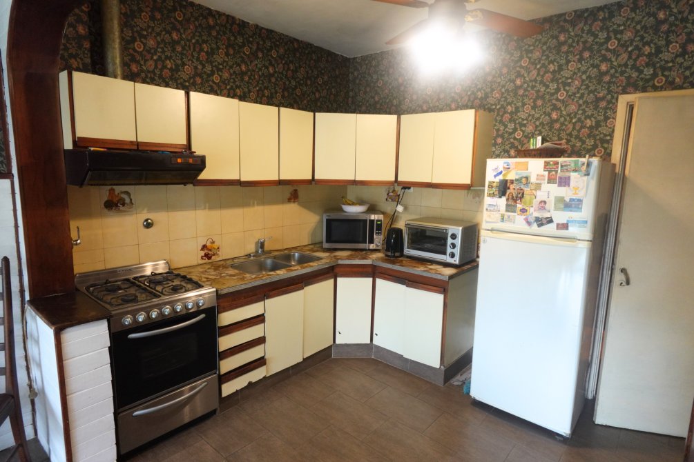 Por el pasillo llegamos a la cocina con muebles alto y bajo mesadas, cocina abierta al comedor con puerta balcón al jardín trasero.