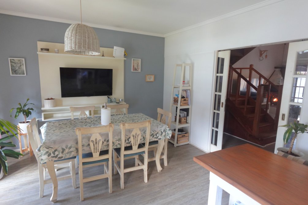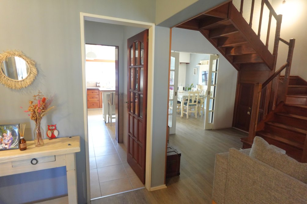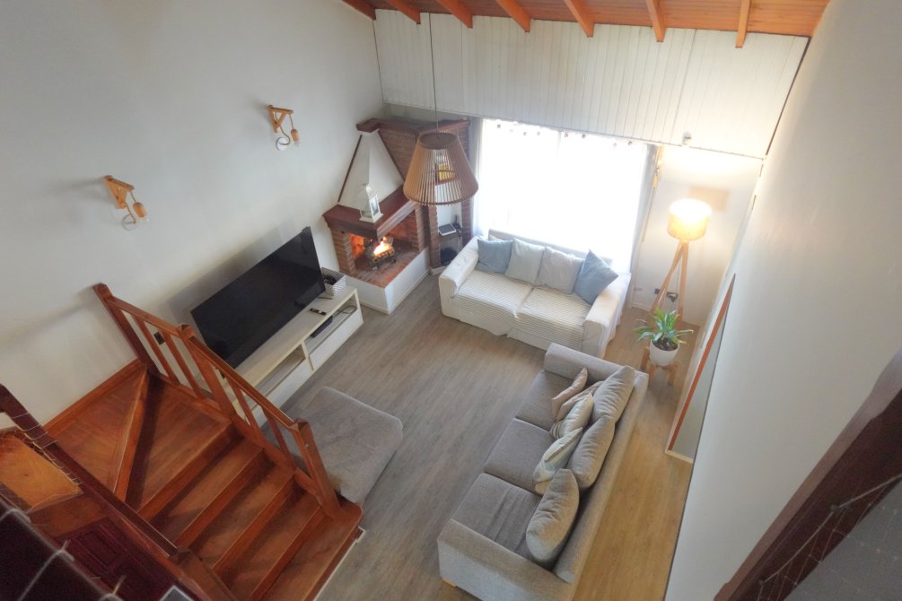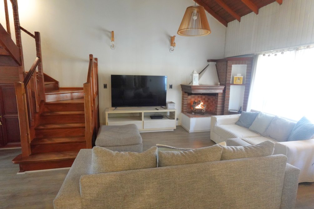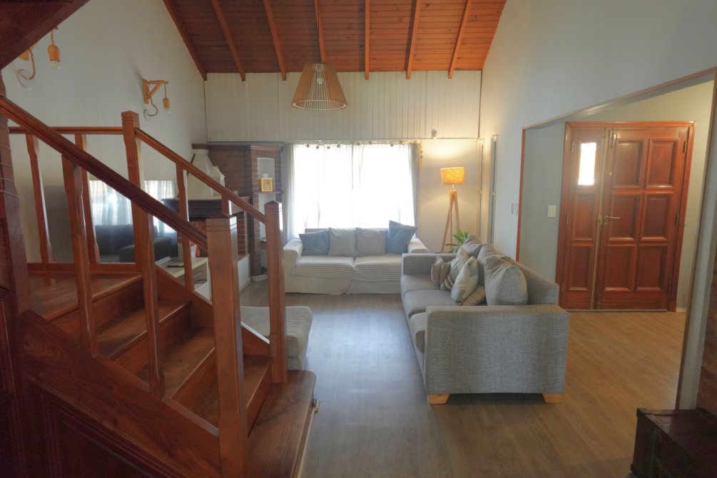 Ya en el ingreso de la propiedad, se encuentra el living con una doble circulación hacía la cocina comedor. El living cuenta con un toilette de recepción, un gran ventanal al frente, hoguera de leños a gas y un mueble bajo la escalera que lleva a la planta alta.