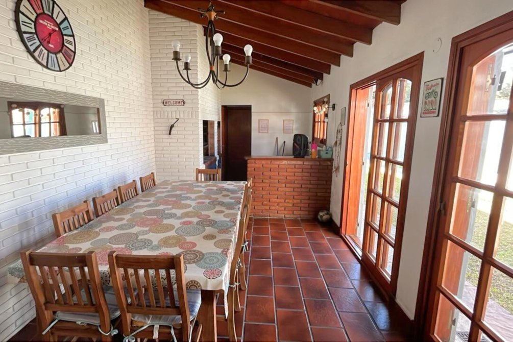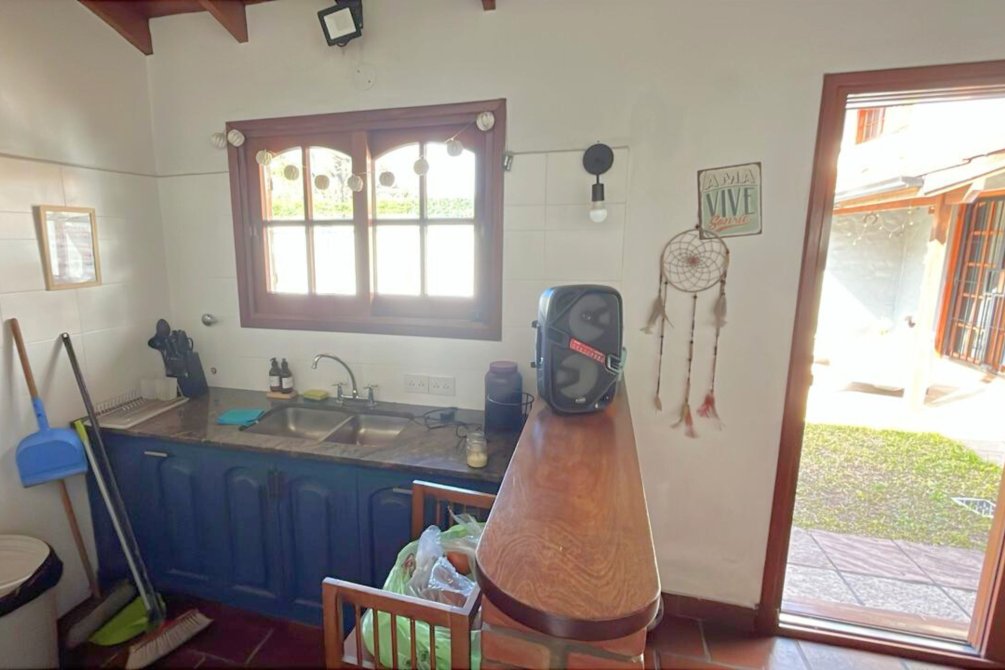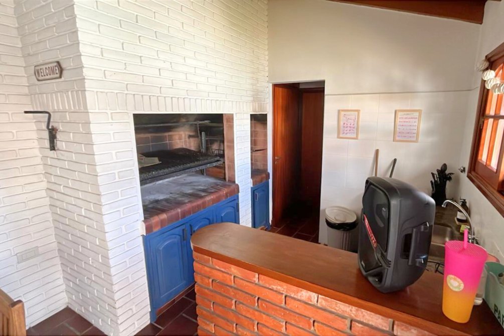 Saliendo desde la cocina, se ingresa al quincho garage donde entran dos vehículos y una mesa para compartir una comida en almuerzo, o sacando la mesa entra un tercer vehículo; cuenta con parrilla, bacha, otro baño auxiliar y un amplio lavadero.