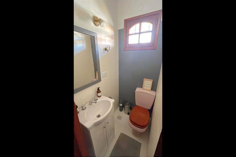 Volviendo a la planta baja, por una parte de la doble circulación tenemos el baño auxiliar, y siguiendo por ese pasillo conectar se ingresa a la cocina con muebles alto y bajo mesada; y en este mismo ambiente abierto se encuentra el comedor con una iluminación natural cruzada.