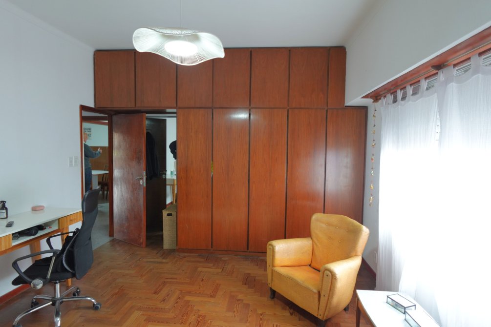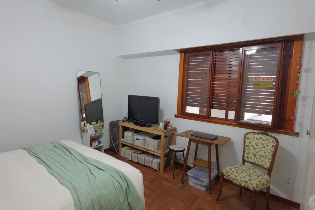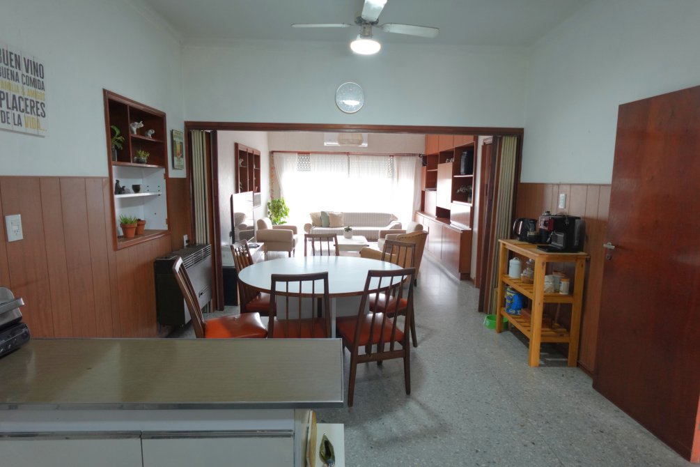 Ya ingresando a la vivienda en planta alta por escalera, se encuentran los 2 dormitorios con piso de parquet y placard, amplio living comedor separado de la cocina con una puerta corrediza. La cocina cuenta con muebles alto y bajo mesada y una ventana que mira hacía el 3er dormitorio, que funciona como dormitorio de servicio.