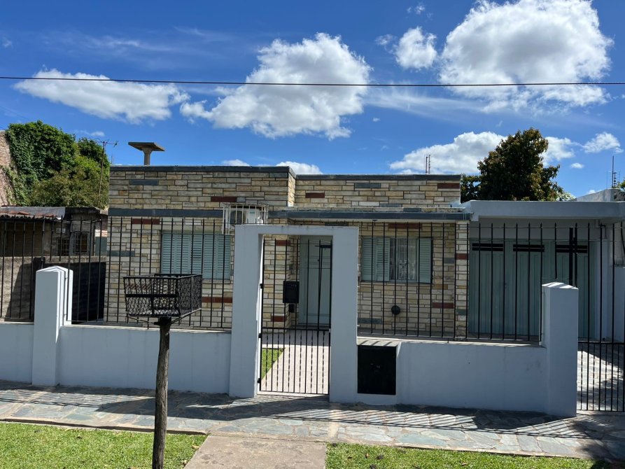 Casa con rejas al frente, entrada de auto descubierta y garage para 1 auto.