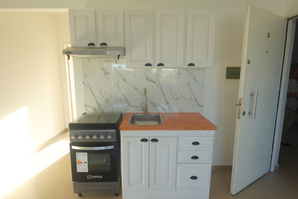 Ingresando al departamento, se encuentra el living comedor con balcón que mira al este y una cocina con muebles alto y bajo mesada. En la parte privada, se encuentra el baño con ducha y la habitación con mueble y con ventilación al oeste.